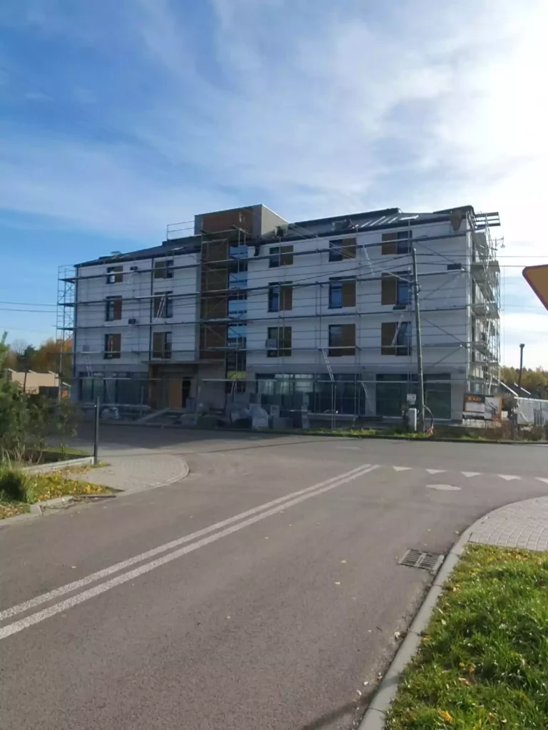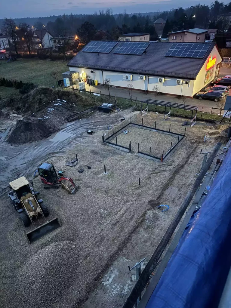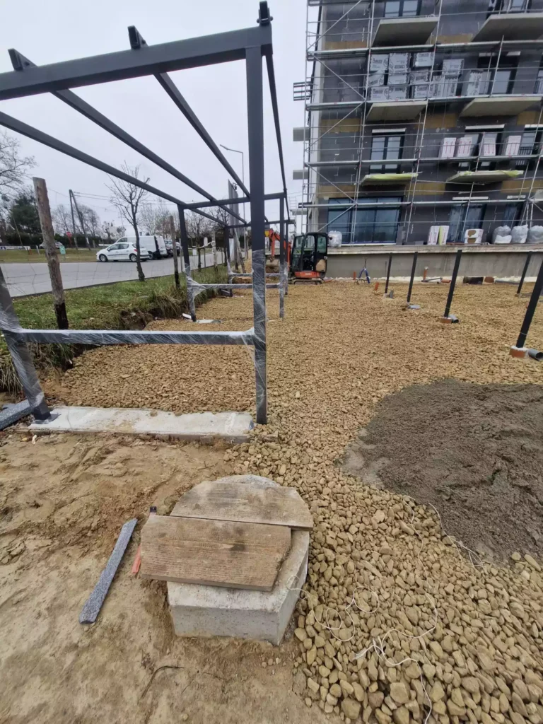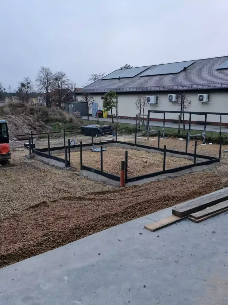 Zakończono realizację docieplenia dwóch ścian budynku. W trakcie realizacji dwie pozostałe ściany. Kontynuacja prac instalacji elektrycznych i sanitarnych oraz tynków wewnętrznych. Rozpoczęto wykonanie podbudowy z tłucznia; dojazdów, chodników, pergoli, placu zabaw, miejsca na rowery. Wykonano słupki ogrodzenia placu zabaw oraz konstrukcję zadaszenia miejsca na rowery.