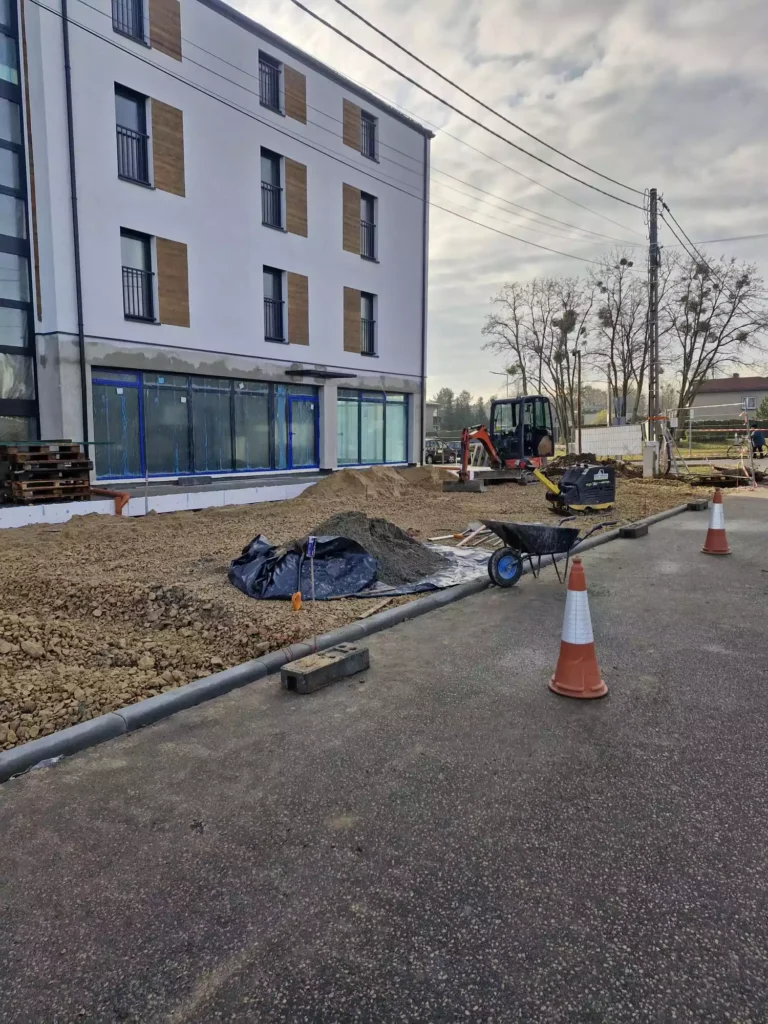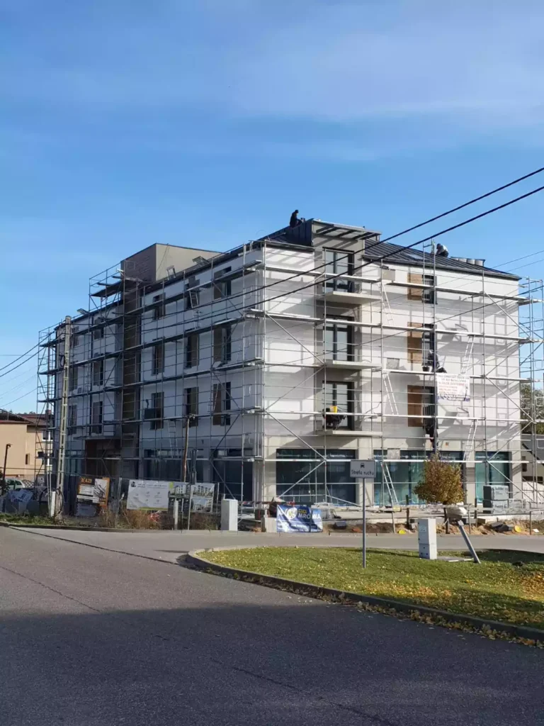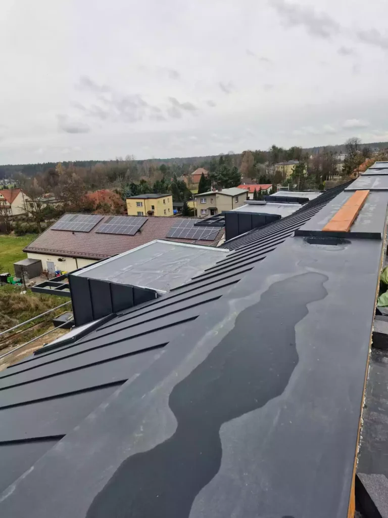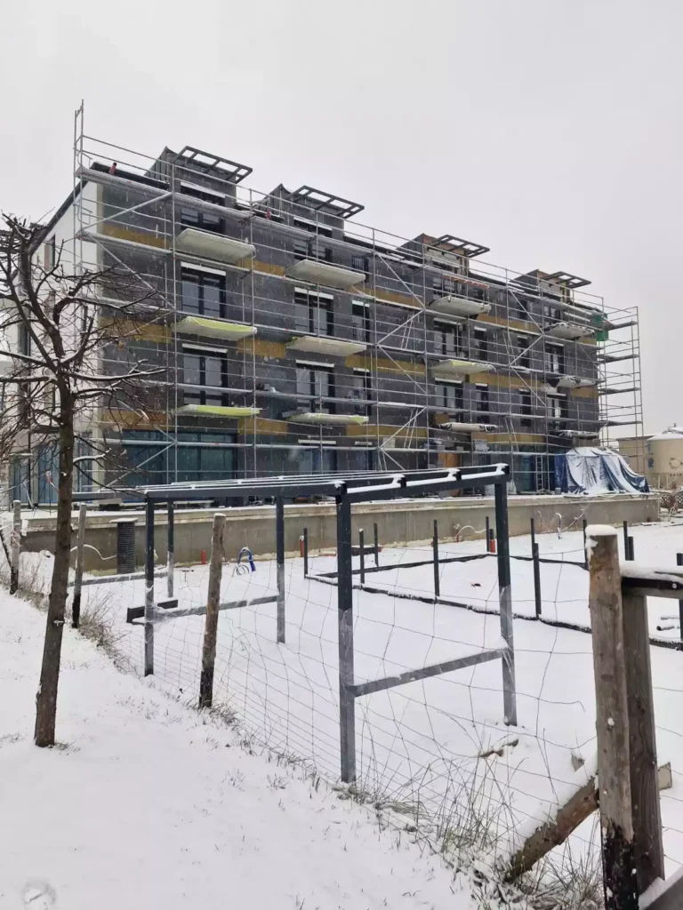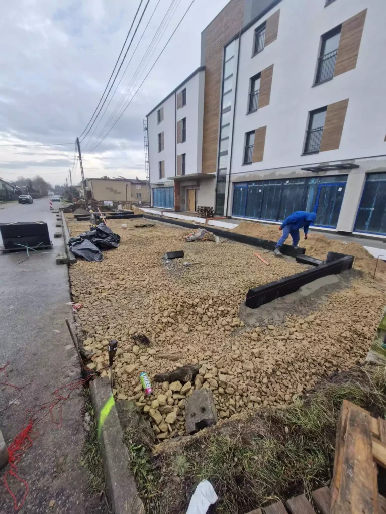 Zakończono realizację docieplenia dwóch ścian budynku. W trakcie realizacji dwie pozostałe ściany. Kontynuacja prac instalacji elektrycznych i sanitarnych oraz tynków wewnętrznych. Rozpoczęto wykonanie podbudowy z tłucznia; dojazdów, chodników, pergoli, placu zabaw, miejsca na rowery. Wykonano słupki ogrodzenia placu zabaw oraz konstrukcję zadaszenia miejsca na rowery.